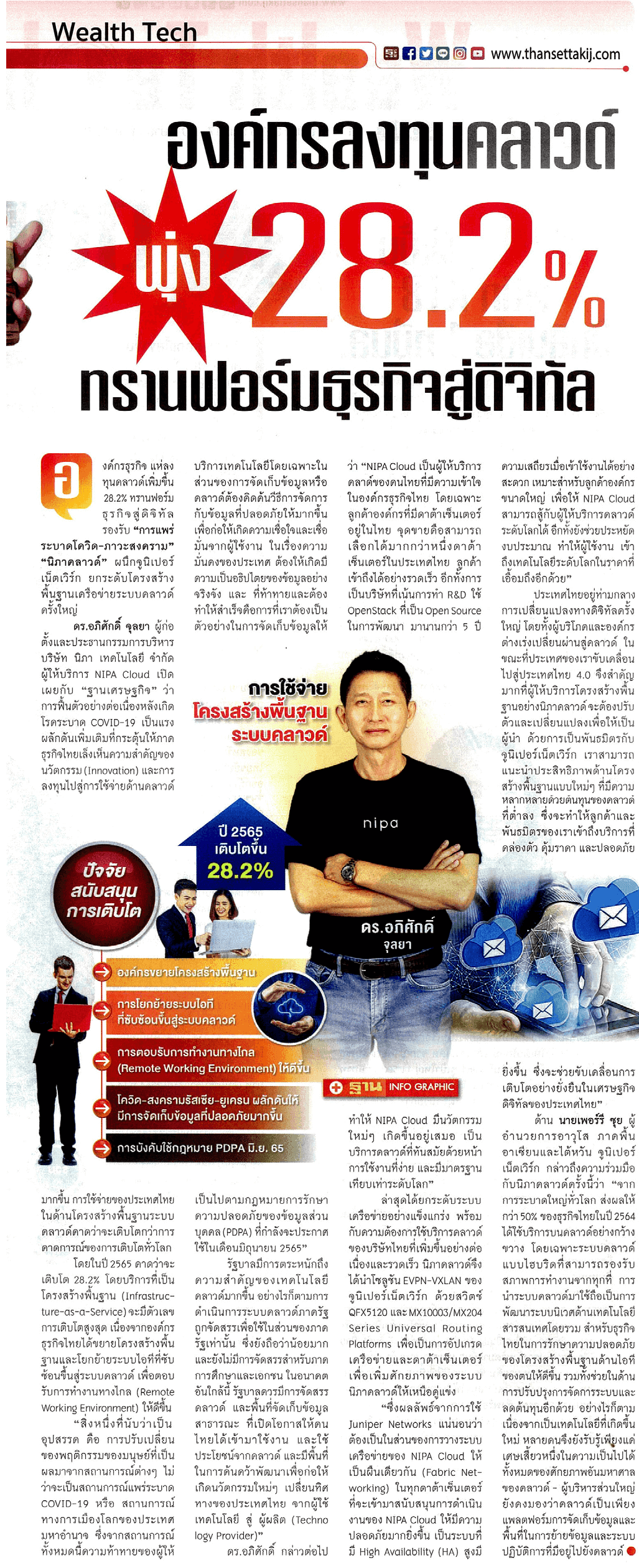 ล่าสุด “NIPA Cloud” ผู้ให้บริการคลาวด์ของคนไทย จึงได้จับมือกับ Juniper Networks โดยได้นำโซลูชัน EVPN-VXLAN ด้วยสวิตช์ QFX5120 และ MX10003/MX204 Series Universal Routing Platforms มาใช้ เพื่อเพิ่มศักยภาพทั้งในด้านเครือข่ายและ Data Center ของ NIPA Cloud ให้สามารถสู้กับผู้ให้บริการคลาวด์ระดับโลกได้ พร้อมทั้งมีความปลอดภัยและมีระบบที่ High Availability (HA) สูง มีความเสถียรเมื่อเข้าใช้งาน เหมาะสําหรับลูกค้าองค์กรขนาดใหญ่ อีกทั้งยังช่วยประหยัดงบประมาณ ทําให้ผู้ใช้งานเข้าถึงเทคโนโลยีระดับโลกในราคาที่เอื้อมถึง อันเป็นการตอบสนองกับเทรนด์ประเทศไทยที่มีการเติบโตในด้านโครงสร้างพื้นฐานระบบคลาวด์ที่เพิ่มมากขึ้น