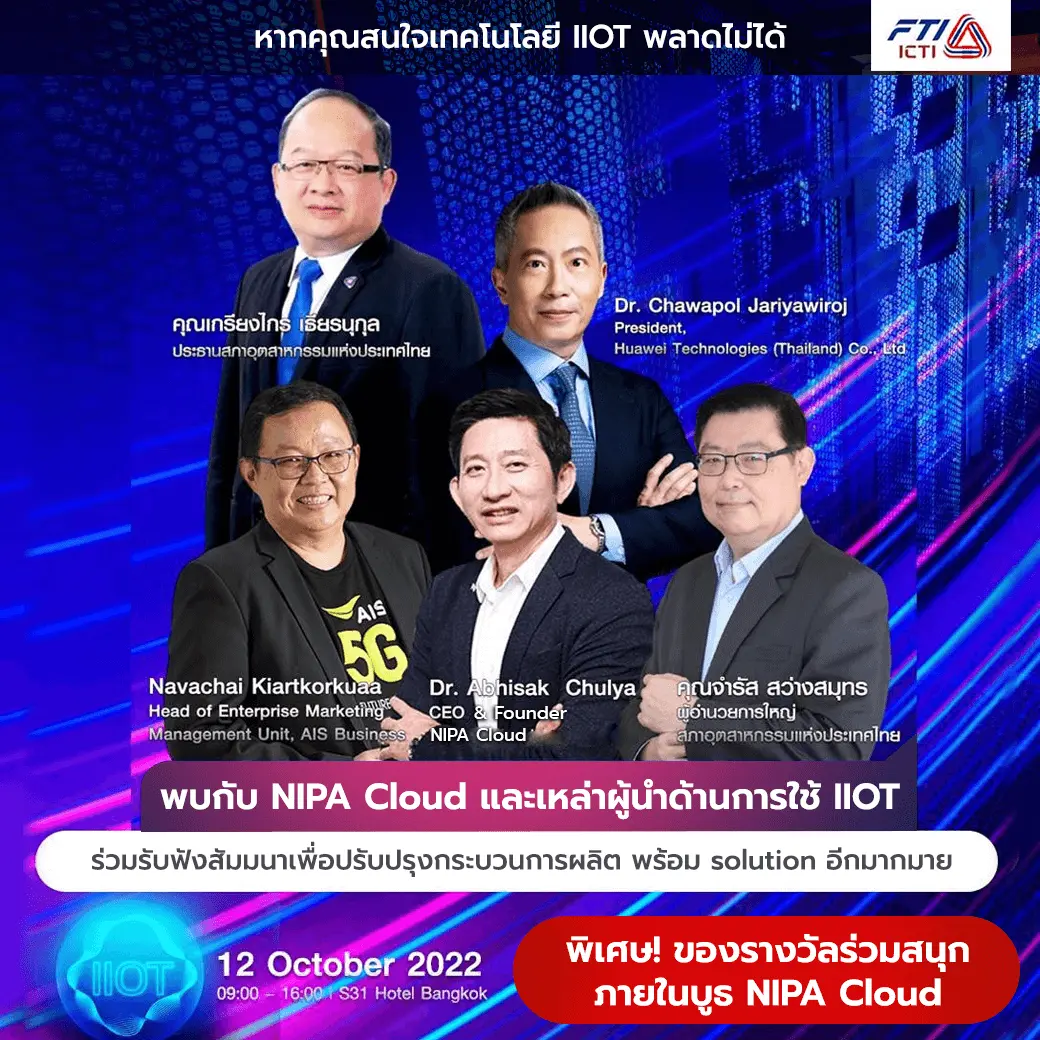 ภายในบูทของเราจะได้พบกับการนำ IoT solutions ไม่ว่าจะเป็น 5G, IoT, Edge และ Cloud มาบูรณาการร่วมกับการดำเนินงานทางธุรกิจ ที่จะมีเหล่าผู้เชี่ยวชาญมาให้ความรู้และตอบคำถามให้กับผู้ที่สนใจ นอกจากนี้ ดร.อภิศักดิ์ จุลยา CEO & Founder ของ NIPA Cloud จะมาร่วมพูดคุยและขึ้นบรรยายเกี่ยวกับการนำเทคโนโลยีมาปรับใช้ในองค์กรธุรกิจไทย พร้อมยกตัวอย่างกรณีศึกษาที่สามารถนำไปใช้ได้จริง เหมาะสม และตอบโจทย์การใช้งานขององค์กรธุรกิจไทยมากที่สุด ไม่ว่าจะอุตสาหกรรมไหนก็ไม่ควรพลาดเป็นอย่างยิ่ง!